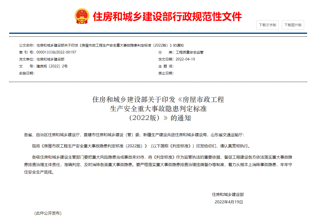 住房和城乡建设部关于印发《房屋市政工程生产安全重大事故隐患判定标准(2022版)》的通知